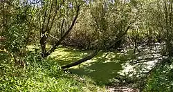 Atascadero Creek springs from the north flank of English Hill, just north of Burnside Road, about 3 miles (5 km) southwest of Sebastopol. It descends to the north, flowing under Barnett Valley Road, Watertrough Road, and Bodega Highway. It continues north through Ragle Ranch Regional Park in the city of Sebastopol,[3] then crosses Mill Station Road, Occidental Road, Graton Road, and Green Valley Road to enter Green Valley Creek about 2 mi (3 km) northwest of Graton.[4] Atascadero Creek is the central channel of the Atascadero Wetland system, designated by the Army Corps of Engineers. It falls under increased protection with the 2015 “new rule” augmenting the 1972 Federal Clean Water Act. As a tributary to Green Valley Creek, Atascadero Creek and wetlands are part of the greater Russian River watershed.