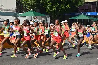 ![]() View of a congested group of competitors during the Women's marathon race | |||||||||||||