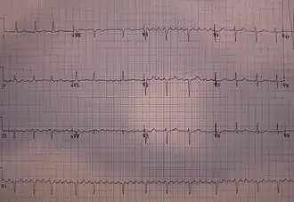 Atrial flutter (AFL) is a common abnormal heart rhythm that starts in the atrial chambers of the heart.[1] When it first occurs, it is usually associated with a fast heart rate and is classified as a type of supraventricular tachycardia (SVT).[2] Atrial flutter is characterized by a sudden-onset (usually) regular abnormal heart rhythm on an electrocardiogram (ECG) in which the heart rate is fast. Symptoms may include a feeling of the heart beating too fast, too hard, or skipping beats, chest discomfort, difficulty breathing, a feeling as if one's stomach has dropped, a feeling of being light-headed, or loss of consciousness.