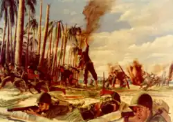 Leyte, Philippine Islands, 20 October 1944. "The American Army returned to the Philippines over the beaches of Leyte Island. Red Beach was defended by the Japanese occupying a number of large, well-camouflaged pillboxes. Immediately after their landing, the leading elements of the 3d Battalion, 34th Infantry – one of the units of the U.S. Army's 24th Division – were pinned down by heavy machine gun and rifle fire. The Regimental Commander, Colonel Aubrey S. Newman, arrived on the beach and, taking in the situation at a glance, shouted to his men: 'Get up and get moving! Follow me!'"[3]