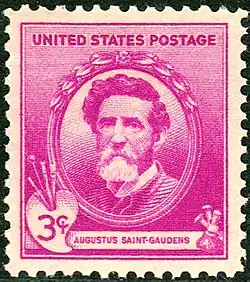 In 1940, the U.S. Post Office issued a series of 35 postage stamps, 'The Famous American Series', honoring America's famous artists, poets, educators, authors, scientists, composers and inventors. The renowned sculptor Augustus Saint-Gaudens was among those chosen for the 'Artists' category of this series and appears on this stamp, which was first issued in New York City on September 16, 1940.[30]