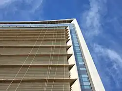 Occupying a triangular block, the building tower is oriented in an east-west axis, with blind facades at the east and west ends - the ones which receive more intense sunlight.[4] The north and south façades, with milder insolation, are glazed to take advantage of natural lighting, and the north façade is covered with horizontal brises soleil to soften direct solar incidence during the winter.[7]