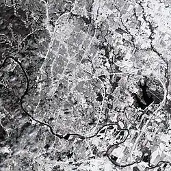 Austin occupies a total area of 305.1 square miles (790.1 km2). Approximately 7.2 square miles (18.6 km2) of this area is water.[7] Austin is situated at the foot of the Balcones Escarpment, on the Colorado River, with three artificial lakes within the city limits: Lady Bird Lake (formerly known as Town Lake), Lake Austin (both created by dams along the Colorado River), and Lake Walter E. Long that is partly used for cooling water for the Decker Power Plant. Mansfield Dam and the foot of Lake Travis are located within the city's limits.[33] Lady Bird Lake, Lake Austin, and Lake Travis are each on the Colorado River.[33]