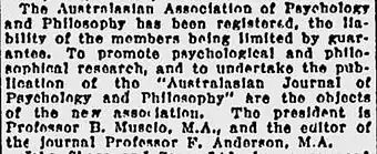 2. ^ "Psychology and Philosophy: An Australian Society", The West Australian, (Monday, 23 April 1923), p.11.