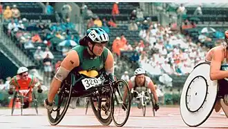Louise Sauvage, from Perth, won gold in the Women's 1,500 m T52-53 (time of 3:30.45, a world record), gold in the Women's 400 m T53, with a result of 54.96, a Paralympic record, gold in the Women's 5,000 m T52-53 time of 12:40.71, a world record, and a final gold in the Women's 800 m T53 (time of 1:52.80, a Paralympic record).[14] Louise's world record in the 1500 m took 6 seconds off the previous record, and her record in the 5000 m took place only an hour after winning the 400 m.[2]