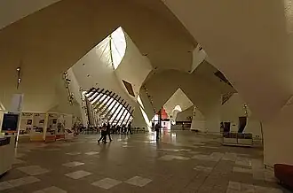 The shape of the main entrance hall continues this theme: it is as though the otherwise rectangular building has been built encasing a complex knot which does not quite fit inside the building, and then the knot taken away. The entirely non-symmetrical complex is designed to not look like a museum, with startling colours and angles, unusual spaces and unpredictable projections and textures.