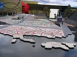 As designed by architect Howard Raggatt (design architect and design director for the project), the museum building is based on a theme of knotted ropes, symbolically bringing together the stories of Australians. The architects stated: "We liked to think that the story of Australia was not one, but many tangled together. Not an authorized version but a puzzling confluence; not merely the resolution of difference but its wholehearted embrace."[8] The building is meant to be the centre of a knot, with trailing ropes or strips extending from the building. The most obvious of these extensions forms a large loop before becoming a walkway which extends past the neighbouring AIATSIS building ending in a large curl, as if a huge ribbon has haphazardly unrolled itself along the ground. Known as the "Uluru Axis" because it aligns with the central Australian natural landmark, the ribbon symbolically integrates the site with the Canberra city plan by Walter Burley Griffin and the spiritual heart of indigenous Australia.