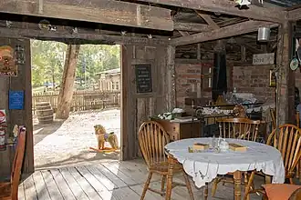 Originally sited in Wilberforce on the south-west corner of the Putty Road and King Street, only a couple of hundred metres from its present relocation site, this blacksmith's shop was operated by George Atkins from 1862 when he rented it as a new shop from David Wenban, son of Wilberforce schoolmaster John Wenban. George Atkins, a blacksmith of exceptional ability, in 1874 invented the single furrow steel plough, which revolutionised Hawkesbury cropping. At the Sydney International Exhibition of 1879 he received a "commended" Award for his entries of a plough and scuffler. Atkins' single furrow plough was highly regarded and late in the nineteenth century there was scarcely a farm in the district that did not have an Atkins plough. George's son William and grandson William were blacksmiths in the same premises spanning over 80 years. When the business closed down in 1943.[12] Of particular interest is the original stone quenching trough used by the Atkins family, located at the rear of the blacksmith's shop. An Atkins plough is on display in the Blacksmith's shop at the Australiana Pioneer Village today. This whole section of the original shop was moved intact to the Village in May 1970 by Silvio Biancotti.[4]