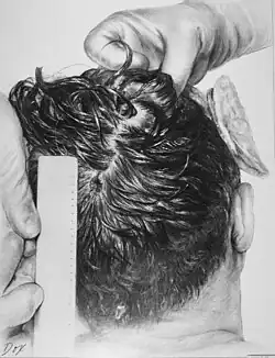 - The large and irregularly-shaped wound in the right side of the head (chiefly to the parietal bone, but also involving the temporal and occipital bone) is described as being about 13 centimetres (5.1 in) wide at the largest diameter.[39]