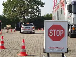 Autoslalom (auto slalom, slalom) is a form of motorsport that takes place on short, temporary courses marked out on areas of sealed-surfaces such as car parks or disused airport runways. Competitors are timed to complete the course, with penalties given for diverting from the route or for touching the course markers. Each competitor starts individually and speeds are kept low to emphasise safety and to require good vehicle control.[1][2][3]