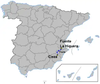 The Autovía A-33 is a highway in Murcia, Spain between Cieza and Font de la Figuera.[1] It follows or is an upgrade of the N-344 and will link the Autovía A-30 east of Cieza with the Autovía A-31/Autovía A-35 at Font de la Figuera north east of Murcia. It passes via Jumilla and Yecla over the Sierra del Buey close to the Puerto de Jumilla (810m).