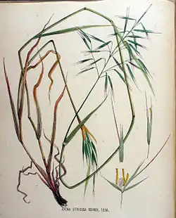 Avena strigosa (also called lopsided oat, bristle oat or black oat; syn. Avena hispanica Ard.) is a species of grass native to Europe. It has edible seeds and is often cultivated as animal feed in southern Brazil. It is sometimes reported as a weed.