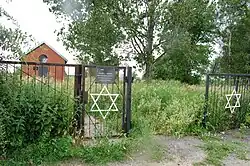 Jewish cemetery in Sochaczew, with the restored, red-brick ohel in background.