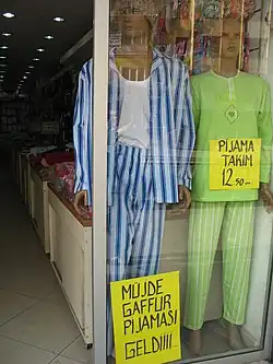 The striped flannelette pajamas that were worn by the character of Gaffur, the son of the doorman family played by Peker Açıkalın, became among the fashionable items at the time.[32] The pajamas, which were produced originally many years prior to the show by Sümerbank but had not been much bought recently, became popular again with the program and were put on display on the mannequins in a number of markets.[32] At the time, the media reported that in a number of cities (including Batman[33]) the pajamas had been sold out[34] and instead were being offered in the black market.[35] The sales eventually stopped as Gaffur's storyline came to an end.[36] Additionally, under the influence of the character and his appearance in the pajamas, Gaffur Nasılım Spor was founded in Şırnak and a rock group called Gaffur was initiated in Beyoğlu.[37] A group of young people in İdil district of Şırnak founded the "Gaffur Nasılım Spor" and participated in a football tournament organized by the district governor of İdil.[38]