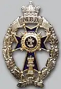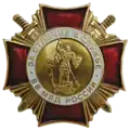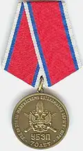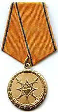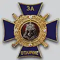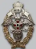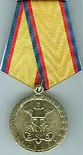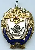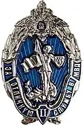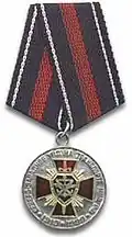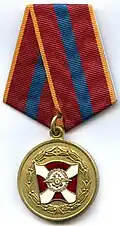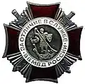 Awarded to military personnel of the troops of the Interior Ministry of the Russian Federation for excellent performance in training; for distinction in the performance of military duties; for merit in the protection of public order and public security; for courage, dedication and high achievements displayed during military service. Abrogated from the MVD awards system by order 602 of October 2013, it is no longer awarded.[19][1][2] |