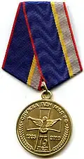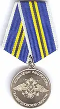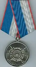 Awarded to employees of law enforcement bodies of the Russian Federation, to federal civil servants, to employees of the Interior Ministry of Russia, for high performance in service and diligence in the performance of tasks during a period of martial law, a state emergency, an anti-terrorist operation, in the context of an armed conflict, in the aftermath of accidents, natural or man-made disasters or other emergencies.[1][4][7] |