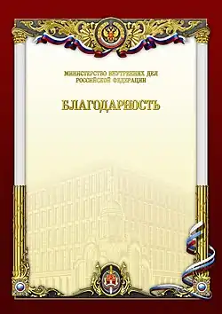 "Certificate of Gratitude of the Minister (Deputy Minister) of the Interior of the Russian Federation" «Благодарность Министра (заместителей Министра) внутренних дел Российской Федерации» |