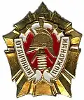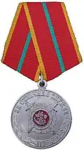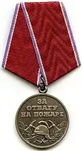 Awarded to members of the Interior Ministry, the military forces of the Interior Ministry of Russia, employees of the State Fire Service and in some cases to other citizens of the Russian Federation for courage and dedication while extinguishing fires, rescuing people and saving property from fire; for leadership in leading efforts in fire fighting and rescuing people; for courage, determination and high professionalism as demonstrated in preventing an explosion or fire. Abrogated from the MVD awards system by order 602 of October 2013, it is no longer awarded.[2][21] |