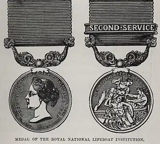 - ^ Examples of silver medals: "1847: Two sisters waded into a stormy sea to rescue 3 men from stranded smack. "Fishguard Lifeboat Station". Historypoints.org. Retrieved 29 January 2021. 1884: A woman on shore held onto a rope in a storm, allowing 15 crew of ship to get ashore. "The woman who saved 15 sailors from drowning". BBC News. 10 August 2018. Archived from the original on 10 August 2018. Retrieved 10 August 2018."