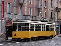A Class 1500 streetcar on line 29 (now replaced by lines 9 and 10) in Corso Colombo, restored to the original 1920s white-and-yellow livery.