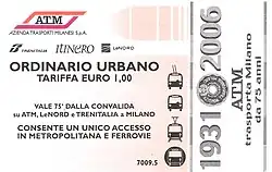 Azienda Trasporti Milanesi S.p.A. ("Milanese Transports Company JSC"; ATM) is the municipal public transport company of Milan and 46 surrounding metropolitan municipalities.[4] It operates 5 metro lines (see Milan Metro), 17 tram lines (see Trams in Milan), 122 bus lines and 4 trolleybus lines (see Trolleybuses in Milan), carrying about 776 million passengers in 2018.[5]