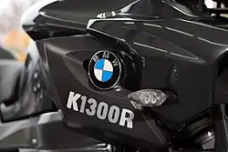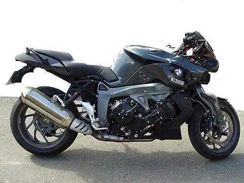 The BMW K1300R is a naked motorcycle made by BMW from 2008 to 2015. When launched, it replaced the K1200R as BMW's flagship urban motorcycle. BMW says the K1300R produces 173 hp (129 kW) @ 9,250 rpm and 140 N⋅m (100 lbf⋅ft) torque @ 8,250 rpm from its 1,293 cc (78.9 cu in) inline-four engine.[1] The engine was subtly modified by British company Ricardo plc.[2] It has an exhaust butterfly flap to boost torque and improve exhaust note.[3] The K1300R features BMW's optional ESA-II electronic suspension adjustment. The bike also has a conventional indicator switch instead of the usual BMW three button configuration.