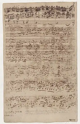 The compositional technique in Variatio V can be compared with the five-part organ work Nun komm der Heiden Heiland of Georg Friedrich Kauffmann and with Bach's earlier partita, O Gott, der fromme Gott, BWV 767.[32] Referring to Scheibe's "sublime fire", Yearsley (2002) describes the overwhelming climax in the final stretto passage of Variatio V: "This contrapuntal density generates an expansion of the texture and with the accompanying dynamic boost bursts the shackles of counterpoint, erupting into expressive brilliance and grandeur—the ultimate rhetorical summation".[30][32][31]