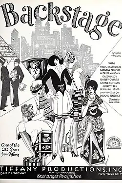 Backstage is a 1927 American silent comedy film directed by Phil Goldstone and starring William Collier Jr., Barbara Bedford and Alberta Vaughn.[1] It was produced and distributed by the independent studio Tiffany Pictures.