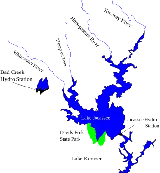 The Bad Creek Hydroelectric Station is a pumped-storage hydroelectric power station located 8 miles (13 km) north of Salem in Oconee County, South Carolina. The 1,065 megawatts (1,428,000 hp) power plant is owned by Duke Energy and its last generator was commissioned in 1991. The power station generates electricity by shifting water between an upper and lower reservoir. The upper Bad Creek Reservoir was created by damming Bad Creek and West Bad Creek while Lake Jocassee serves as the lower reservoir. During periods of low energy demand, the four 266 megawatts (357,000 hp) Francis pump turbines pump water from Lake Jocassee which lies at an elevation of 1,110 feet (340 m) to the Bad Creek Reservoir at an elevation of 2,310 ft (704 m) through a 1 mile (1.6 km) tunnel. When energy demand is high, water is released back from Bad Creek Reservoir back down to the pump turbines which then operate as generators. After electricity is produced, the water is returned to Lake Jocassee. The process is repeated as needed, primarily with the facility serving as a peaking power plant.[1][2][3]