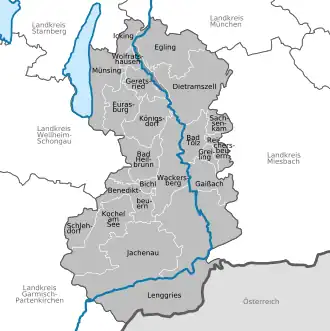 Lake StarnbergAmmerseeAustriaEbersberg (district)Garmisch-Partenkirchen (district)Landsberg (district)Miesbach (district)Munich (district)Rosenheim (district)Starnberg (district)Weilheim-SchongauWolfratshauser ForstPupplinger AuPupplinger AuBad HeilbrunnBad TölzBenediktbeuernBichlDietramszellEglingEurasburgGaißachGeretsriedGreilingIckingJachenauKochelKönigsdorfLenggriesMünsingReichersbeuernSachsenkamSchlehdorfWackersbergWolfratshausen