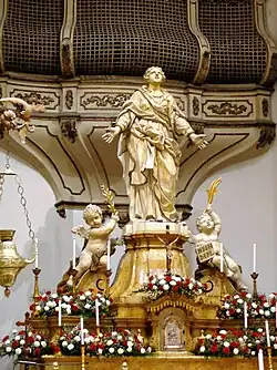 The interior is an elongated octagon with white marble floors and yellow Castronovo marble, a material selected by the architect Nicolò Daniele. In 1782 Giovanni Battista Marino, Mario Biondo and Giovanni Battista Amato completed the stucco altarpiece statues, depicting in the side altars: St Benedict, the Immaculate Conception, St Joseph, and St Euplio. The main altar has a Statue of Saint Agatha reminiscent of Ercole Ferrata's Sant'Agnese on the Pyre in the Roman church of Sant'Agnese in Agone. The church consecration ceremony was completed in 1796. Under the dome hangs a large glass chandelier.