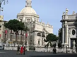 Badia di Sant'Agata or Abbey of St Agatha is an 18th-century Roman Catholic church and attached female convent located on Via Vittorio Emanuele #182 in the center of Catania, region of Sicily, Southern Italy. The Baroque style church facade is across the street from the left transept of the Cathedral of Catania.