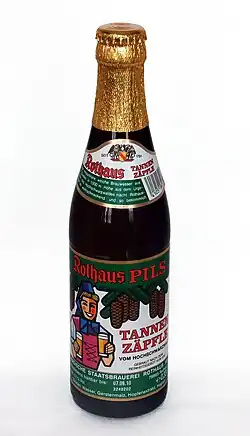The brewery's most successful product, a Pilsner-style beer, "Rothaus Tannenzäpfle" or simply "Zäpfle", is sold in 33 cl (12 imp fl oz; 11 US fl oz) bottles and is available in stores throughout Baden-Württemberg. It is well known as a "cult beer" throughout Germany and is sold in supermarkets, kiosks and various nightlife establishments. Tannenzäpfle literally means "little fir cone" and is a reference to the shape of the bottle. Despite Rothaus refraining from intensive advertising campaigns, the demand for the once-local beer has spread throughout Germany.