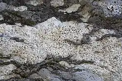 Bagliettoa is a genus of lichen-forming fungi in the family Verrucariaceae.[1] Bagliettoa species are endolithic, growing between the grains of solid rock. These lichens are almost invisible to the naked eye, living mostly hidden within limestone and other calcium-rich rocks with only a thin polished rim visible on the surface. They reproduce through tiny flask-shaped fruiting bodies that bore neat pits into the rock as they develop.