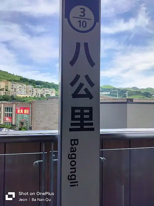 Bagongli station (Chinese: 八公里站; pinyin: Bāgōnglǐ zhàn) is a station on Line 3 of Chongqing Rail Transit in Chongqing Municipality, China.[1][2] It is located in Banan District. It opened in 2012.