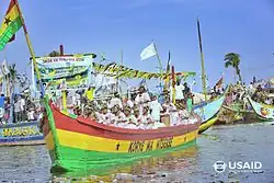 The Dutch reported existence of the festival at least as far back as 1847 and was mentioned in a report by Governor Cornelis Nagtglas in 1860.[2] The festival is used to mark the beginning of the fishing season in Elmina.[3] The name Bakatue is from the Fante dialect and translates as "draining of a lagoon".[4] The celebration of the festival was instituted to commemorate the founding of Elmina by the Portuguese in the early days of the colonization of the then Gold Coast.[4] It also is used to offer thanks and prayers to the gods for a good fishing year.