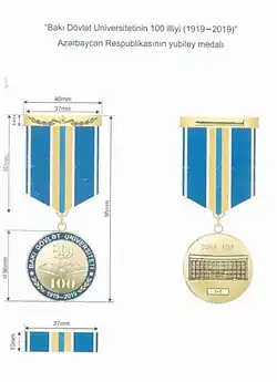The Jubilee medal of "100th Anniversary of Baku State University (1919-2019)” (Azerbaijani: Bakı Dövlət Universitetinin 100 illiyi (1919-2019)” Azərbaycan Respublikasının yubiley medalı) is a state award of Azerbaijan dedicated to the 100th anniversary of the establishment of Baku State University. The award was established on October 22, 2019 in accordance with the amendments to the “Law on Establishment of Orders and Medals of Azerbaijan”.[1][2][3]