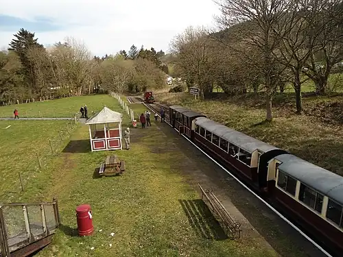 The first station for Bala opened on the site in 1868 but closed in 1882 when the Bala (New) station opened nearer the town. Opened by the Great Western Railway in 1934, it closed in 1939.[1] In 1976 the Bala Lake Railway opened its eastern terminus on the site.[1] The Bala Lake Railway began passenger services in 1972, and opened extensions in 1973 and 1975. Bala was reached in 1976. Writing in the railway directory "Steam '81" the general manager, G H Barnes, stated: "We aim to be in Bala near Loch Cafe in 1981, distance then 5.25 miles."[2] This was an official prediction of the further extension of the line into Bala town centre, but the work was not carried out, and the statement was not repeated in the following year's directory, "Steam '82", leaving Bala (Llyn Tegid) as the eastern terminus of the line.