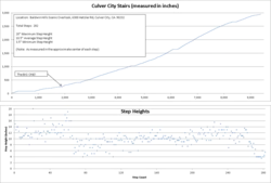 The tallest single step measures approximately 20 inches (51 cm) (located adjacent to the only intermediate landing without a curved bench for resting). The average step height is 10.5 inches (27 cm), and the shortest is 3.5 inches (8.9 cm). An information sign posted at the trail entrance near the intersection of Jefferson Blvd. and Hetzler Rd. states that the staircase is 715 feet (218 m). In the center of the landing between the 247th and 248th steps is a bronze marker stating the elevation, surrounded by two semi-circular engravings: