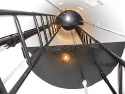 The tower was built in 1972[2] and is located in Kühlungsborn Ost immediately next to the beach promenade, not far from the pier. The border defence soldiers of the Coastal Brigade had the task of observing shipping movements on the Baltic Sea and identifying escape attempts. By means of a fixed telescope with high magnification, the four-man crew could observe a wide area up to 12 nautical miles from the observation platform. At night the vicinity could be illuminated with a searchlight on the roof of the tower.[1] The basic equipment on the observation deck included a radio station, a stand-by generator and heating.[1] Below the windows were sealable embrasures for weapons.[1] The guards recorded every apparently suspicious movement.[1] The radio equipment was part of the border reporting network, so border patrol vessels and land-based units could be alerted immediately.[1]