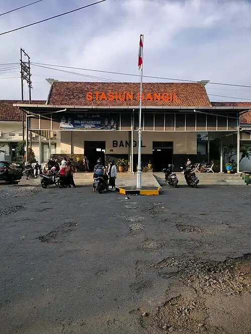 Bangil Station (BG) is a class I (one) railway station located in Pogar, Bangil, Pasuruan Regency; entered within eastern border of Operational Area VII Surabaya of Kereta Api Indonesia (KAI) at the height of ± 9 meters above sea level (railway line Surabaya-Bangil). To the east of this station, there are branches towards Pasuruan-Probolinggo-Jember-Banyuwangi and to Malang.