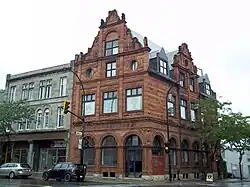 the building is a particularly good example of the Queen Anne Revival style, as expressed in commercial architecture... Built for the bank of the same name, the Bank of Montréal building is a rare surviving example of the Queen Anne Revival style applied to a commercial building. Its use of Flemish motifs in imitation of a Flemish public building is typical of the style.