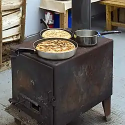 There were many regional variations of bannock that included different types of flour, and the addition of dried or fresh fruit.[11] Cooking methods were similarly diverse. Some rolled the dough in sand then pit-cooked it; the sand was then brushed off. Other groups baked the bannock in clay or rock ovens. Others wrapped the dough around a green, hardwood stick and toasted it over an open fire.[11] Bannock's functionality made it simple to cook and consume while conducting daily activities at home, or hunting, trapping, fishing, and gathering out on the land.[10]