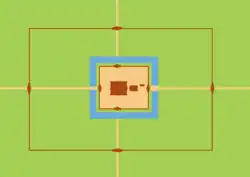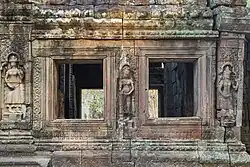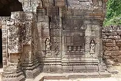The second enclosure, which is part of the main temple, measures 58 m × 50 m (190 ft × 164 ft). It has a gopura on its eastern side and also subsidiary gopura on the west. Entrance doors are at the northern and southern ends.[4] The gopura is built like a gallery with one exterior wall and double row of pillars which open into a courtyard and which has mostly shored up walls with small openings at the bottom to allow air circulation. The niches here are decorated with images of apsaras, and a Buddha statue in the central hall has been defaced by vandals. Bayon style architectural features built-in are the "balustered false windows with lowered blinds and devatas with headdresses in the form of small flaming discs set in a triangle." The vaults built in sandstone and laterite have collapsed at several locations of the gallery.[12] The inner enclosures contain library building to its north and south and also a central sanctuary.[7]
