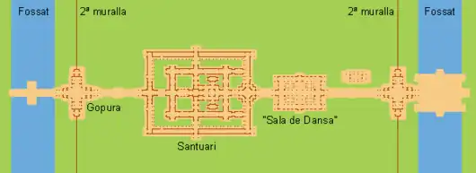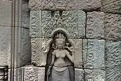 The third enclosure has a gopura which has a cruciform plan. It has pillars which are crossed by vaults. There are three passages in this enclosure, two on either side are independent, with laterite walls. The niches here have small figurines, and large apsara devatas in single poses or in pairs of dancing poses. Large Buddha images, in an internal courtyard of this enclosure, have been defaced by vandals. A paved access from here leads to the main shrine, which comprises two galleried enclosures. At the entrance to these enclosures, from the eastern end, is the "Hall of Dancers", which has four open courtyards and the pillars have fine carvings of apsaras.[12]