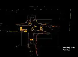 Banteay Kdei (Khmer: ប្រាសាទបន្ទាយក្តី; Prasat Banteay Kdei, lit.'A Citadel of Chambers'),[1] also known as "Citadel of Monks' cells",[2] is a Buddhist temple in Angkor, Cambodia. It is located southeast of Ta Prohm and east of Angkor Thom. Built in the mid-12th to early 13th centuries AD during the reign of Jayavarman VII (who was posthumously given the title "Maha paramasangata pada"[3]), it is in the Bayon architectural style, similar in plan to Ta Prohm and Preah Khan, but less complex and smaller. Its structures are contained within two successive enclosure walls, and consist of two concentric galleries from which emerge towers, preceded to the east by a cloister.[4][5]