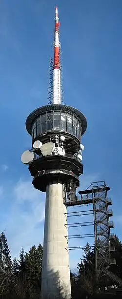 Bantiger TV Tower is a 196 metre tall tower used for FM- and TV-transmission at 46°58′40″N 7°31′43″E / 46.97778°N 7.52861°E / 46.97778; 7.52861 on the Bantiger mountain, a mountain east of Bern situated in the municipality of Bolligen. The Bantiger TV Tower was built between 1991 and 1996 as replacement of a 100 metres tall radio tower, built in 1954. Bantiger TV Tower, which was inaugurated in 1997 has a public observation deck in a height of 33.7 metres. In contrast to most other observation decks on TV towers, there is no elevator for visitors access. The access to the deck goes via a stairway, which is not inside the tower, but in a lattice tower attached to the towers main structure.