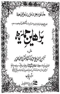 Al-Barāhīn al-Ahmadīyyah 'alā Haqīqatu Kitāb Allāh al-Qur'ān wa'n-Nabūwwatu al-Muhammadīyyah (Ahmadiyya Arguments in Support of the Book of Allah - the Qur'an, and the Prophethood of Muhammad) is a five-part book written by Mirza Ghulam Ahmad, the founder of the Ahmadiyya Movement. The first two parts were published in 1880 CE, the third volume was published in 1882, the fourth volume in 1884 and the fifth volume in 1905. In writing the book, Ghulam Ahmad sought to rejuvenate Islam by arguing for the validity of its principles and vindicating its teachings in response to Christian and Hindu polemics against Islam as well as atheistic philosophies.[1] In this context, a significant portion of the subject matter of the book is dedicated to the defence of Islam as a whole against the criticism of Muhammad, the Qur'an and Islam that was raised in the 18th and 19th centuries predominantly by Christian missionaries and Hindu revivalists.