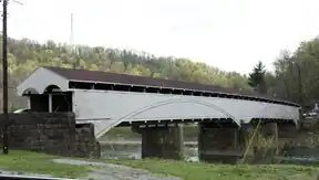 View of Philippi, county seat of Barbour County. Visible are the historic Philippi Covered Bridge spanning the Tygart Valley River and the main administrative building and chapel of Alderson Broaddus University atop "Battle Hill" (upper left) overlooking the town.