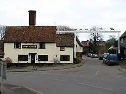 A well-known landmark in the village is the sign of the "Fox and Hounds" public house. On top of a beam are painted silhouette figures of huntsmen and hounds chasing a fox into the gable of the public houses at the top of Church End. Although it is a long-established feature of the village, the sign has not always been at its present site.[6] In 1955 the Fox and Hounds, with its famous sign, was a pub located in the High Street, at the time part of an important route to London. In 1955 the Fox & Hounds burned down in a disastrous fire. The sign, which was partially saved, moved to its present site and the existing pub (the Wagon and Horses) was renamed. The pub and its sign are Grade II listed.